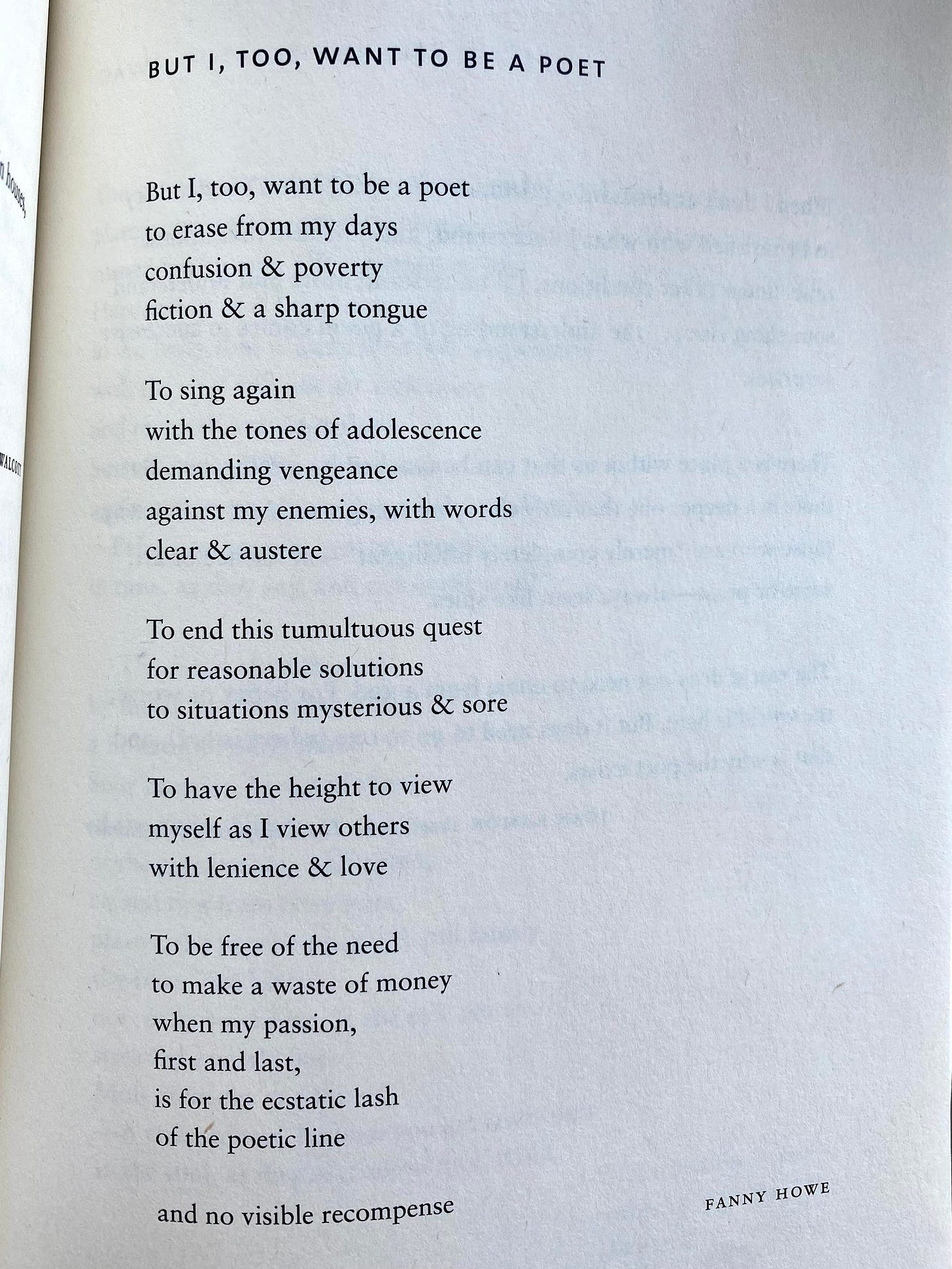 So for today: a poem. This is a poem I found in a collection called Joy: 100 poems. The poem is by Fanny Howe who was born in 1940 and raised in Cambridge, Massachusetts (my home state). The poem is titled, ‘But I, Too, Want to be a Poet.’