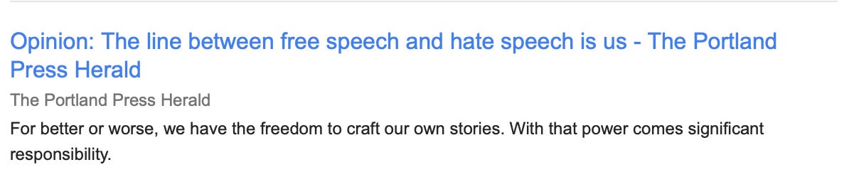 I wanted to share an article I published in my hometown paper this past Sunday, The Portland Press Herald. The article explores how we, readers and story consumers, have a role to play when it comes to differentiating between free speech and hate speech. I’d love to hear any feedback and hope to engage in a conversation about how to teach media literacy to the general public.